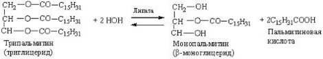 Липаза ускоряет гидролиз внешних, то есть, сложноэфирных связей в молекулах триглицеридов (жиров):