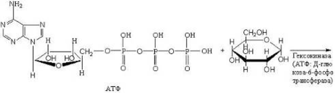 Фосфотрансферазы. Сюда относят ферменты, ускоряющие реакцию переноса остатков фосфорной кислоты. К фосфотрансферазам относится, например, гексокиназа – фермент, ускоряющий перенос остатков фосфорной кислоты от молекулы АТФ к глюкозе (с этой реакции обычно начинается преобразование глюкозы):