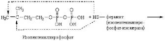 Изопентенилпирофосфат-изомераза катализирует реакцию перестройки изопентилпирофосфата в диметилаллилпирофосфат, что связано с перемещением двойной связи из 3-го во 2-е положение:
