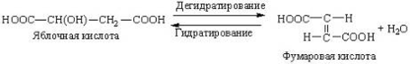 Другую важную группу лиаз составляют углерод-кислород-лиазы (гидролиазы), ускоряющие реакции гидратирования и дегидратирования органических соединений. В качестве представителя гидро-лиаз приведем фумарат-гидратазу: