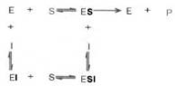 Следует указать, что неконкурентное ингибирование также может быть обратимым и необратимым, поскольку отсутствует конкуренция между субстратом и ингибитором за активный центр. Примеры необратимого ингибирования приведены ранее. При обратимом неконкурентном ингибировании субстрат S и ингибитор I связываются с разными центрами, поэтому появляется возможность образования как комплекса EI, так и тройного комплекса EIS; последний может распадаться с освобождением продукта, но с меньшей скоростью, чем комплекс ES.