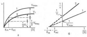 а - в координатах v от [ S ] ; б - в координатах 1/v от 1 / [ S ] ; Vmaxи Vi - максимальные скорости реакции; Кm и Kmi - константа Михаэлиса соответственно в отсутствие (1) и в присутствии (2) ингибитора.