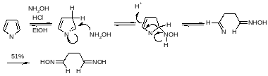 2Н- и ЗН-Пирролиевые катионы в сущности представляют собой иминиевые ионы и, следовательно, обладают свойствами электрофилов. Эти катионы играют ключевую роль в процессах полимеризации и восстановления пирролов в присутствии кислот. При взаимодействии пирролов с гидрохлоридом гидроксиламина, сопровождающимся раскрытием цикла и образованием 1,4-диоксимов, вероятно, образуется более реакционноспособный ЗН-пирролиевый катион. Для защиты аминогруппы первичных аминов могут быть превращены в 1-К-2,5-диметилпирролы, затем защитная группа может быть удалена с помощью описанной выше реакции с гидроксиламином.