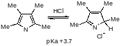 Значение рКа определено для большого числа производных пиррола, а сам незамещенный пиррол — чрезвычайно слабое основание со значением рКа -3,8. Основность пиррольного цикла весьма быстро увеличивается при введении алкильных заместителей, и для 2,3,4,5-тетраметилпиррола рКа равен +3,7, что соответствует полному протонированию всех молекул пиррола в вышеприведенных условиях (для сравнения рКа анилина +4,6). Таким образом, алкильные группы оказывают необычайное стабилизирующее влияние на катионы - пирролы, содержащие трет-бутильные группы, при протонировании образуют стабильные кристаллические соли.