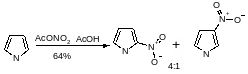Нитрующую смесь, применяемую для нитрования производных бензола, нельзя использовать в случае пиррола, поскольку это приводит к его полному разложению. Однако нитрование пиррола возможно при использовании ацетилнитрата при низких температурах, причем преимущественно образуется 2-нитро-пиррол. Ацетилнитрат получают при смешивании дымящей азотной кислоты с уксусным ангидридом, и в результате образуется уксусная кислота и достигается удаление сильной минеральной кислоты. При нитровании пиррола с использованием ацетилнитрата активность положения 2 в 1,3 • 105, а положения 3 в 3 • 104 раза выше активности бензола.