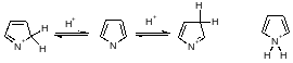 В растворе наблюдается обратимое присоединение протона по всем положениям пиррольного цикла. Наиболее быстро протонируется атом азота, присоединение протона по положению 2 проходит в два раза быстрее, чем по положению 3. В газовой фазе при использовании кислот умеренной силы, таких, как C4H9+ и NH4+, пиррол протонируется исключительно по атомам углерода, причем склонность к присоединению протона по положению 2 выше, чем по положению 3. Наиболее термодинамически стабильный катион - 2Н-пирролиевый ион - образуется при присоединении протона по положению 2 и определяемое значение рКа для пиррола связано именно с этим катионом. Слабая N-основность пиррола обусловлена отсутствием возможности для мезомерной делокализации положительного заряда в 1H-пирролиевом катионе.