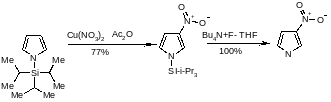 Введение заместителя к атому азота увеличивает долю продукта нитрования по положению 3 в смеси продуктов реакции: так, введение метального заместителя обусловливает получение смеси продуктов β- и α-нитрования в соотношении 1:3. Более объемная трет-бутильная группа приводит даже к обращению относительной реакционной способности — продукты β- и α-нитрования образуются в соотношении 4:1. Полного подавления реакции нитрования по α-положению пиррола можно достигнуть при введение к атому азота триизопропилсилильной (TIPS) группы; использование последней чрезвычайно важно при синтезе 3-производных, так как в последствии она может быть легко удалена.