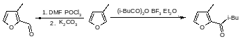 Формилирование фуранов по Вильсмейеру обеспечивает удобный подход к формилфуранам, хотя не меньшую роль играют легкая доступность фурфурола в качестве исходного материала, а также важны методы, включающие литиирование фуранов. Формилирование замещенных фуранов происходит согласно правилу предпочтительного образования α-замещенных производных, несмотря на все другие факторы; так, и 2-метилфуран, и метиловый эфир фуран-3-карбоновой кислоты дают 5-альдегид, а 3-метилфуран превращается главным образом в 2-альдегид.