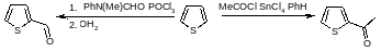 Ацилирование по Фриделю-Крафтсу наиболее часто используется для тиофенов и обычно дает хорошие выходы в контролируемых условиях. Несмотря на то, что при взаимодействии тиофена с AlCl3 получаются смолы, их образования можно избежать, если добавлять катализатор к тиофену и ацилирующему агенту. Наиболее часто в качестве катализатора используют хлорид олова. Эффективный метод — ацилирование ангидридами, катализируемое фосфорной кислотой. В реакциях с ацетил-п-толуолсульфонатами в отсутствие катализаторов с высоким выходом образуется 2-ацетилтиофен. При формилировании тиофена по Вильсмейеру получают 2-формилтиофен. 2-Формилпроизводное образуется также из 3-фенилтиофена в условиях реакции Вильсмейера.