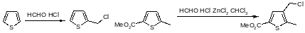 Кислотно-катализируемые реакции тиофена с альдегидами и кетонами неприменимы для получения гидроксиалкилтиофенов, так как они нестабильны в условиях реакции. Однако можно осуществить хлоралкилирование, а при использовании хлорида цинка даже тиофены, имеющие электроноакцепторные заместители, вступают в эту реакцию. Необходимо тщательно подбирать условия, так как возможно образование как ди-2-тиенилметанов, так и 2,5-бис(хлорметил)тиофена.