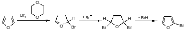 Фуран энергично реагирует с хлором и бромом при комнатной температуре с образованием полигалогенированных соединений, но не реагирует с иодом. В более контролируемых условиях можно получить 2-бромфуран. реакция, по-видимому, протекает через образование 1,4-дибром-1,4-дигидроаддукта, поскольку такие частицы были действительно обнаружены при низкой температуре с использованием спектроскопии ПМР. В реакции с бромом в диметилформамиде при комнатной температуре гладко образуются 2-бром - и 2,5-дибромфураны.