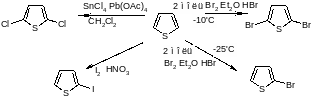 Галогенирование тиофена происходит очень быстро и как при комнатной температуре, так и при -30 °С в темноте легко проходит тетразамещение . Скорость галогенирования тиофена при 25 °С примерно в 108 раз больше, чем бензола. Образование как 2,5-дибром - и 2,5-дихлортиофенов, так и 2-бром- и 2-иодтиофенов гладко происходит в различных контролируемых условиях. Контролируемое бромирование 3-бромтиофена дает 2,3-ди-бромтиофен.