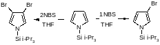 При монобромировании и моноиодировании N-триизопропилсилилпиррола образуются практически исключительно 3-галогенозамещенные пирролы, а использование двух эквивалентов N-бромсукцинимида позволяет получить 3,4-дибромпроизводное