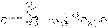 Вследствие высокой стабильности тиофенов в их реакциях электрофильного замещения могут быть успешно использованы комбинации ряда реагентов с сильными кислотами, обычно приводящие к кислотно-катализируемому разложению и полимеризации фуранов и пирролов. Изучение катализируемого кислотами обмена на атом водорода других групп, например кремния или ртути , показало, что скорость атаки по положению 2 примерно в 1000 раз выше, чем по положению 3. Так, для 2,5-ди-трет-бутилтиофена рКа при образовании соли за счет протонирования по положению 2 составляет —10,2.При обработке тиофена горячей фосфорной кислотой получается тример, строение которого предполагает, что на первой стадии образование связи С—С вдет через α-протонированный катион.