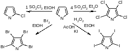 Галогенирование пиррола протекает настолько легко, что, если специальным образом не контролировать течение реакции, образуются исключительно стабильные тетрагалогенопроизводные. Попытки провести моногалогенирование простых алкилпирролов оказались безуспешными, поскольку при этом образуются чрезвычайно реакционноспособные пиррилалкилгалогениды - продукты галогенирования боковой цепи.