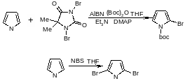 2-Бром - и 2-хлорпирролы — нестабильные соединения, которые можно получить прямым галогенированием пиррола. Использование 1,3-дибром-5,5-диметилгидантоина в качестве бромирующего агента приводит к образованию 2-бром - и 2,5-дибромпирролов; продукты бромирования стабилизируют немедленным превращением в N-трет-бутилоксикарбонильные производные. Бромирование N-трет-бутилоксикарбонилпиррола с использованием N-бромсукцинимида приводит к 2,5-дибромпроизводному