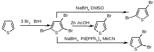 Трибромирование тиофена гладко протекает в 48%-ном растворе НВг. Давно известно, что при обработке полигалогенотиофенов цинком и кислотой удается селективно удалять α-галоген, что делает доступным получение 3-бромтиофена, а 3,4-дибромтиофен аналогично образуется при восстановлении тетрабромида. При использовании боргидрида натрия из 2,3,5-трибромтиофена получают 2,3-дибромтиофен (в присутствии катализатора Pd(0))или 2,4-дибромтиофен (без катализатора).