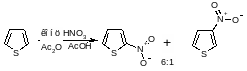 Нитрование тиофена следует проводить в отсутствие азотистой кислоты, которая может привести к взрыву; наиболее удобно использование ацетилнитрата или тетрафторбората нитрония. Наряду с преимущественным образованием 2-нитросоединения получают и 3-изомер с выходом -10%. Дальнейшее нитрование как 2-, так и 3-нитротио-фенов также приводит к образованию смесей: из 2-нитротиофена образуются эквивалентные количества 2,4- и 2,5-динитротиофенов, а из 3-изомера — в основном 2,4-динитротиофен. Аналогично, предсказуемая смесь изомеров образуется при нитровании замещенных тиофенов: например, 2-метилтиофен дает смесь 2-метил-5- и 2-метил-З-нитротиофенов, а 3-метилтиофен -4-метил-2- нитро- и 3-метил-2-нитротиофены в соотношении 4:1 в каждом случае.