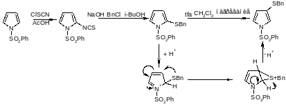 Реакции с использованием других серосодержащих электрофильных реагентов, например сульфинилирование пиррола, тиоцианирование пиррола и 1-фенилсульфоиилпиррола, позволяют получать серосодержащие производные пиррола с атомом серы в более низкой степени окисления.