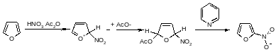 Чувствительность фуранов не позволяет использовать концентрированную кислотную нитрующую смесь. При взаимодействии фурана или замещенных фуранов с ацетилнитратом первоначально образуются неароматические аддукты, в которых образованию продуктов замещения препятствует процесс нуклеофильного присоединения ацетата к катионному интермедиату, обычно по положению 5. Ароматизация с потерей уксусной кислоты, приводящая к образованию нитропроизводного, происходит под действием растворителя; наилучшие результаты достигаются при использовании слабого основания, такого, как пиридин.