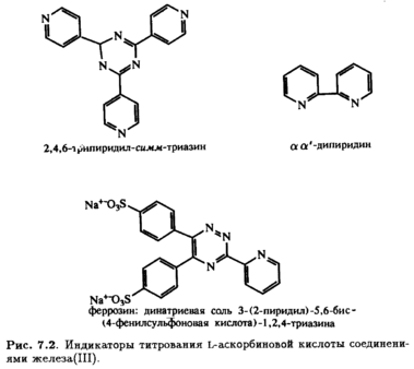 Эта реакция лежит в основе наиболее популярного титриметрического метода анализа витамина С. Она проста в исполнении благодаря легкости определения конечной точки титрования и без труда может быть использована для анализа растворов, содержащих довольно высокие концентрации витамина С. К сожалению, данный метод очень чувствителен к присутствию других восстановителей, с которыми витамин С часто соседствует в растворах (диоксид серы, таннины, ионы металлов, восстанавливающие сахара и т. п.). В каждом конкретном случае есть способы уменьшить влияние примеси, но устранить эффект всех примесных восстановителей в анализируемом растворе одновременно невозможно. И если раствор первоначально окрашен, это маскирует изменение цвета вследствие реакции; в таких случаях для определения конечной точки использовали разнообразные инструментальные методы, например, полярографию. Было предложено много других титрующих реагентов, например, соединения железа(Ш). В этом случае конечную точку определяют при добавлении в качестве индикаторов феррозина, а, а'- дипиридина или 2,4,6-трипиридил-симм-триазина (рис. 7.2).