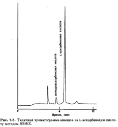 Из нее явствует, что этим методом разделяются не только L-аскорбиновая и дегидроаскорбиновая кислоты, но и продукты их дальнейшего окисления, соответствующие оторым пики также присутствуют на хроматограмме. Это одна из многих методик с использованием ВЭЖХ, пригодных для проведения подобного анализа.