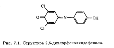 Титриметрические методы основаны на использовании восстановительных свойств L-аскорбиновой кислоты. Обычно она окисляется до дегидроаскорбиновой кислоты. В методике, предложенной еще в 1927 г., используется 2,6-дихлорфенолиндофенол или 2,6-ди-хлор-4[(4-гидроксифенил)имино]циклогексадиен-3,5-он-1, который при нейтральных рН дает синюю окраску, при кислых — розовую, а при взаимодействии с L-аскорбиновой кислотой образует бесцветный продукт. Структура этого соединения приведена на рис. 7.1.