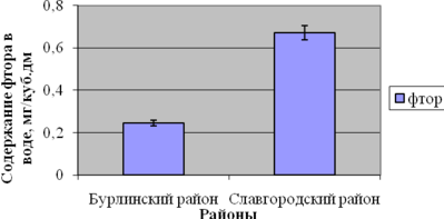 Как мы видим на рисунке 6, более высокое содержание фтора в питьевой воде Краснощековского района. По содержанию фтора Алейский район относится к зоне с очень низким уровнем фтора в воде, а Краснощековский район – к зоне с высоким содержанием фтора в воде.