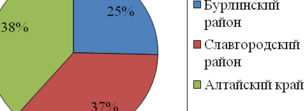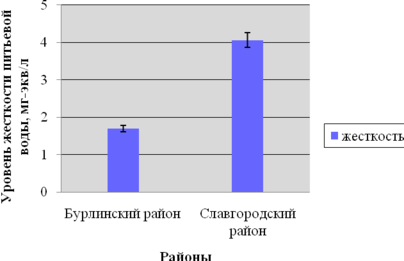 Уровень жесткости питьевой воды выше в Краснощековском районе (рис. 1). Повышение уровня жесткости Краснощековском районе, вероятно, связано с высоким уровнем содержания кальция и магния в почвах и водоемах района (Романов, Харламов, 2004).