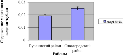 Из рисунка 8 следует, что более высокое содержание марганца в питьевой воде Краснощековского района. Содержание марганца в пределах 0,1 мг/дм. куб. характерно для природных вод (Мосин, 2003).