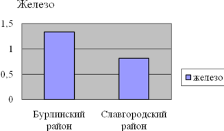 Более высокое содержание железа в питьевой воде Бурлинского района (рис. 5). Это вероятно связано с применения на станциях очистки воды железосодержащих коагулянтов, либо из-за коррозии изготовленных из чугуна или стали водопроводных труб.