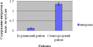 Как следует из рисунка 2 более высокое содержание нитратов в питьевой воде Краснощековского района. Это может быть связано с развитой в районе химической промышленностью.