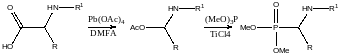 Важным методом получения α-аминофосфоната также является замена ацетатного остатка природных аминокислот на фосфонатную группу при помощи триметилфосфита. Реакция проводтся в две стадии: образованию связи C-P предшествует расщепление аминокислоты тетраацетатом свинца[4]: