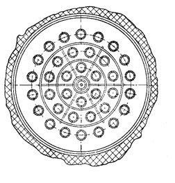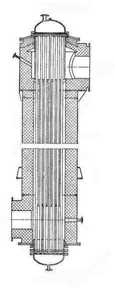 Практически температура в топке не превышает 1000-11000 С. Однако при такой температуре возможен перегрев катализатора и разложение продуктов реакции. Поэтому в верхней части топки топочные газы смешивают с газами, возвращаемыми из борова печи, с таким расчетом, чтобы температура газа была выше 500-5500 С. Газ, имеющий такую температуру, проходит в межтрубном пространстве контактного аппарата прямотоком к парам циклогексанола, движущимся по трубкам с катализатором. Противоток в данном случае недопустим, так как при этом наиболее горячие топочные газы соприкасались бы с парами образовавшегося циклогексанона, вызывая его разложение. Особенностью конструкции контактного аппарата (рис. 10) является наличие в его межтрубном пространстве трех концентрических экранных перегородок, благодаря которым достигается равномерный обогрев контактных трубок. Трубки привариваются к трубным решеткам; благодаря установке в нижней части аппарата специального сальникового устройства трубки при разогревании могут свободно удлиняться. Чтобы предотвратить каталитическое действие железа, которое может вызывать расщепление циклогексанола и усиленное сажеобразование, крышки и контактные трубки изнутри покрывают медью.
