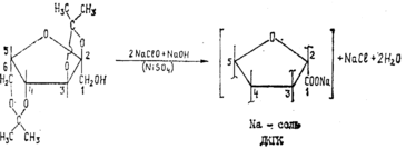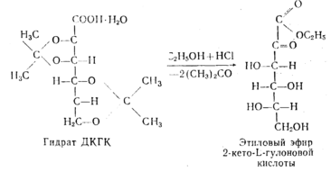 Четвертой стадией промышленного синтеза аскорбиновой кислоты является окисление диацетонсорбозы (ДАС) в 2,3,6-ди-о-нзопропилнден-а- L -кетогулоновую кислоту (ДКГК). Гидрат ДКГК кристаллизуется в виде бесцветных кристаллов с Гп.л=98—99°С, хорошо растворим в спирте, эфире, почти не растворим в ледяной воде. При кипячении с водой гидрат легко омыляется и переходит в 2-кето-Ь-гулоновую кислоту, процесс гидролиза легко идет в кислой среде.