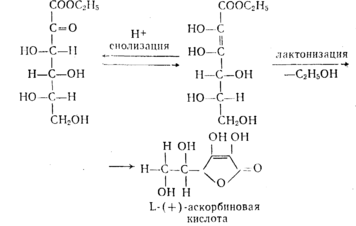 Превращение гидрата ДКГК в аскорбиновую кислоту является сложным процессом и протекает в две основные стадии. Первую стадию можно рассматривать как стадию этерификации и гидролиза, вторую — как «фенолизацию» и «лактонизацию» этилового эфира 2-кето-Г-гулоновой кислоты с образованием аскорбиновой кислоты. Последовательность этих процессов до конца не выяснена, однозначного толкования этих процессов нет.