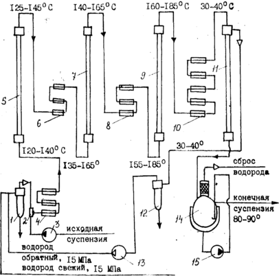 При непрерывном способе более эффективным является применение суспензированного катализатора, т. к. при этом достигается повышение контактной поверхности катализатоpa и наилучшее использование объема автоклава. На основе венгерской лицензионной технологии процесс гидрирования в Йошкар-Оле (рис. 1) осуществляют в каскаде из колонных автоклавов при температуре 140—165°С и давлении 150 атм.