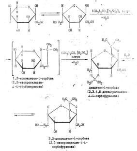 Механизм ацетонирования чрезвычайно сложен, однозначного толкования его нет. Предполагается, что механизм реакции ацетонирования должен учитывать существование L-сорбозы в двух формах—фураноидной и пираноидной, которые, в свою очередь, существуют в а- и р-формах: