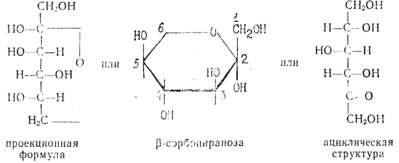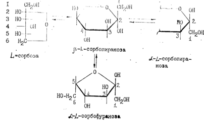-сорбоза является кетогексозсй, в кристаллическом виде имеет р-форму пиранозы. Хорошо растворима в воде, плохо в спирте, Тпл= 165°С. Строение L-сорбозы можно представить различными структурами-