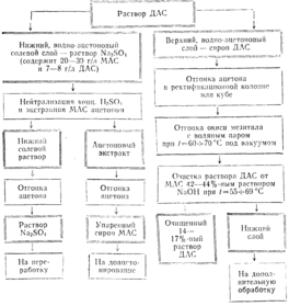 Нейтрализованный водно-ацетоновый раствор MAC и ДАС направляют в отгонный аппарат при температуре 80— 110°С ведут отгонку влажного 10—20%-ного ацетона. Затем упаренный раствор охлаждают до 33—38 °С и производят деление слоев. Процесс проводится или в делительной воронке, или на флорентине, или в колонне непрерывного действия по схеме: