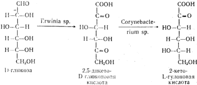 Значительные успехи были достигнуты в получении 2-кето--L-гулоновой кислоты через 2,5"дикето-0-глюконовую кислоту. 2,5-дикето-0-глюконовая кислота может быть получена при окислении глюкозы бактериями рода Gluconobactcr Егwinia. Трансформация полученной кислоты в 2-кето-Ь-гулоно-вую кислоту осуществляется многими бактериями, принадлежащими к родам Corynebacterium, Brevibacterium и др.