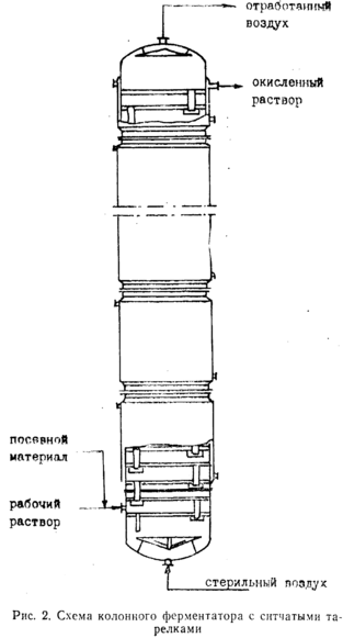 Наиболее эффективно процесс ферментации осуществляется в колонном ферментаторе с сетчатыми тарелками (установка типа УНФ-100). Ферментатор (рис. 2) представляет собой колонну высотой 8,3 м, диаметром — 1,1 м, состоящую из 6 царг с 32 ситчатыми тарелками (рис. 2). Объем рабочей зоны—3,8 м3. В аппарат с определенной скоростью, обеспечивающей необходимую степень превращения D-сорбита в L-сорбозу, непрерывно подается рабочая культура, стерильная среда (водный раствор сорбита с концентрацией D-сорбита 22%), а также сжатый воздух. Процесс проводится при температуре 30—36°С, давлении 0,2—0,5 атм, рН==4—4,5 в течение 28—39 ч. Обогрев осуществляется горячей водой через секционные рубашки. Окисленный раствор непрерывно отводится из верхней части колонного ферментатора в сборник, а затем поступает на доокисление в периодически действующие ферментаторы, где глубина окисления повышается с 70—80% до 95%. Окисленный раствор сорбита с содержанием сухих веществ 20—25% направляют на очистку.