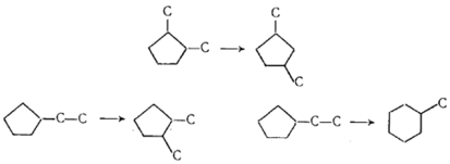 В условиях каталитического риформинга пятичленные нафтены подвергаются изомеризации и реакциям, приводящим к раскрытию циклопентанового кольца. Реакции изомеризации могут сопровождаться либо перегруппировкой алкильных заместителей, либо приводить к превращению пятичленных нафтенов в шестичленные, рисунок 6