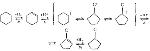 Реакции изомеризации нафтенов протекают по карбкатионному механизму. Промежуточный продукт реакции - циклоолефин, образующийся в результате дегидрирования нафтена на металлическом участке катализатора. Циклоолефин мигрирует на кислотный участок носителя, где превращается в карбкатион. Реакции карбкатиона ведут к образованию изомерного циклоолефина, в результате гидрирования которого на металлическом участке получается углеводород, изомерный исходному. Так, схему изомеризации циклогексана в метилциклопентан можно представить как показано на рисунке 3 (М -металлические участки катализатора, А -кислотные)