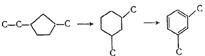 Существует определенная взаимосвязь между расположением алкильных групп в алкилциклопентанах и получаемых ароматических углеводородах. Так, из 1,3-метилалкилциклопентанов получают главным образом мета-замещенные, а из 1,2-метилалкилциклопентанов орто-замещенные бензола, формула 16