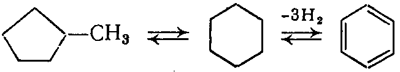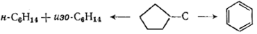 При дегидроизомеризации метилциклопентана на платиновых катализаторах риформинга молярный выход бензола достигает 60-70%. Скорость раскрытия (гидрогенолиза) циклопентанового кольца при наличии двух или трех замещающих метильных групп значительно меньше скорости той же реакции для метилциклопентана Поэтому следует полагать, что селективность превращения более высокомолекулярных алкилциклопентанов в бензольные углеводороды выше селективности превращения метилциклопентана.