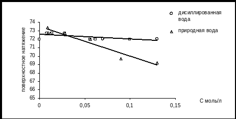 Из рисунка 2 следует, что в растворах с дистиллированной водой ТХУ не проявляет поверхностную активность, тогда как поверхностное натяжение природной воды в присутствии данного компонента незначительно изменяется обратно пропорционально увеличению концентрации растворов.