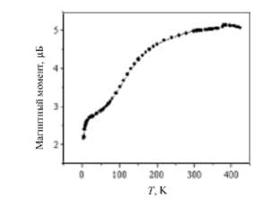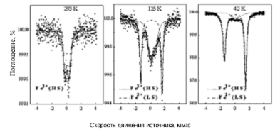 Рис. 4. Температурная зависимость магнитного момента комплекса [Fe(RSalen)2]+PF6- (А) и мессбауэровские спектры комплекса Fe при температурах 293, 125 и 4,2 К (Б)[5].