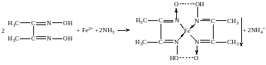 В качестве неофициальных реакций наиболее чувствительным реактивом на железо (II) является спиртовой раствор диметилглиоксима, который образует с железа (II) ионом комплексное хелатное соединение красного цвета, нерастворимое в растворе аммиака [11]: