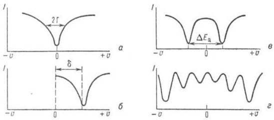 Рис. 7. Схематическое изображение спектров мёссбауэровского резонансного поглощения γ-квантов: I-интенсивность потока γ-квантов, прошедших через поглотитель, u -скорость движения источника γ-квантов относительно поглотителя; а - резонансная линия при u = 0; б, в, г - соответственно изомерный сдвиг (d), квадрупольный дублет (DEQ), магнитная сверхтонкая структура для ядер 57Fe.